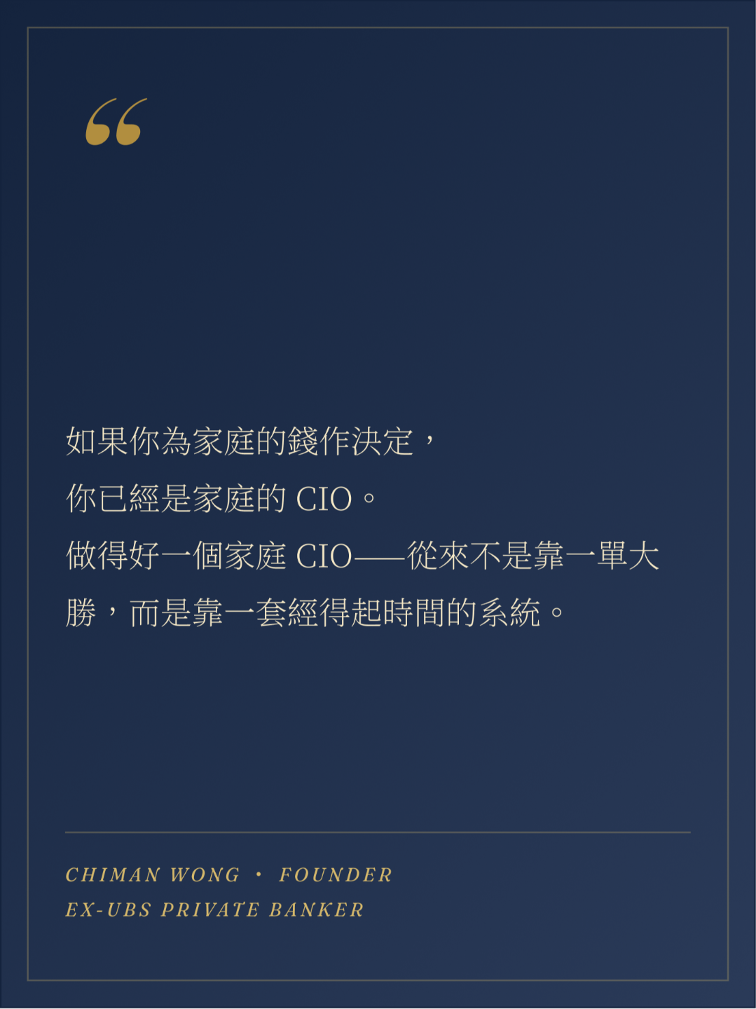 一個香港中產家庭,其實面對同一類工作——只是規模不同。你要決定家裡的錢如何配置、幾時加碼、幾時收手、如何安排子女教育、如何保護父母退休、如何為十年後的自己留一份選擇權。你已經在做 CIO 的工作,只是可能未有一套配得上這個角色的系統。