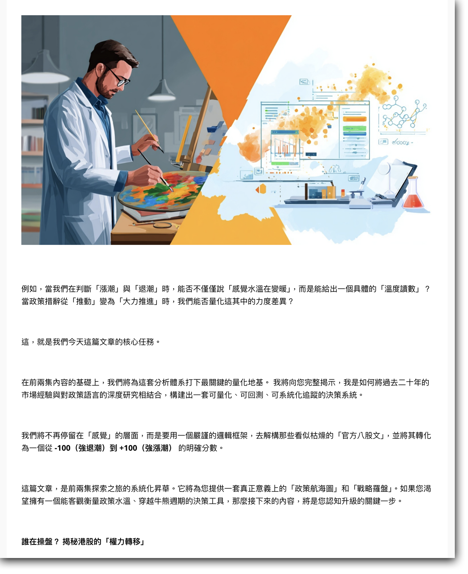 今日【追夢黃金思維 Pro 版】的詳細分析文章,將深入剖析這套溫度讀數背後的完整邏輯。閱讀後,您將有能力自行為政策打分,精準判斷市場趨勢,並學會如何調整資產配置,以真正把握這波以及未來潛在的港股提款密碼。
