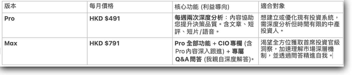 現在,我們正式進入新階段。【追夢黃金思維免費版】依然會每週兩次提供5分鐘的思考內容(與今天的5分鐘內容一致)。而作為詳細版的 Pro 15分鐘內容,Pro版的市場短評 和 Max 追夢問答成長路,將正式結束 Beta 測試,而MAX 更從今天開始加入CIO 專欄,以更精煉、高效、高質量的模式呈現,全面提升您的投資武功。